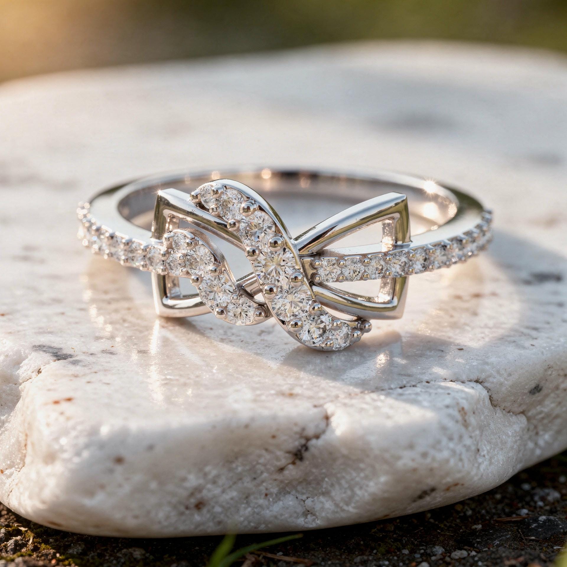 This elegant diamond ring showcases a flowing crisscross infinity design, where two sculpted loops intertwine at the center and are highlighted with pavé-set round diamonds. The open framework creates visual lightness, while the diamond-lined curves add refined brilliance. A perfect blend of movement and symmetry, this ring is designed for modern elegance with symbolic meaning.