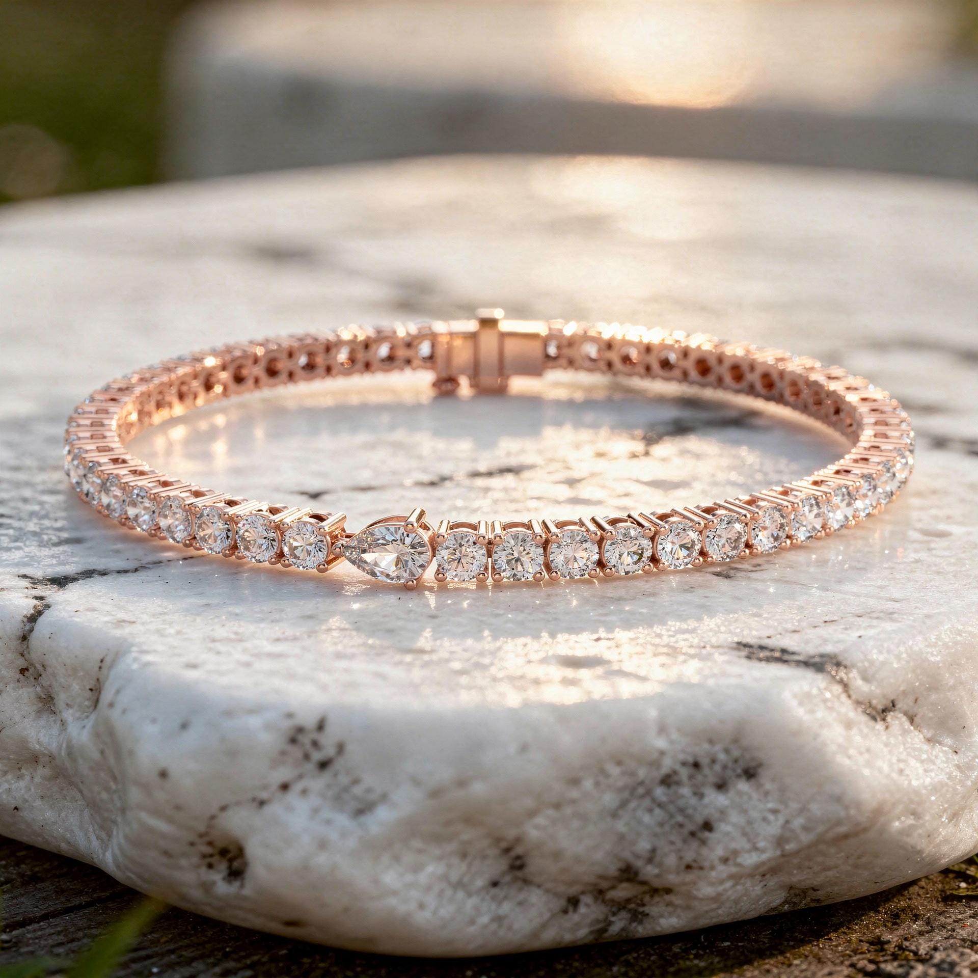 This refined tennis bracelet features a continuous row of round brilliant diamonds, highlighted by a distinctive pear-shaped diamond accent that adds a unique focal point to the classic design. The subtle contrast between round and pear shapes enhances brilliance while maintaining timeless elegance.