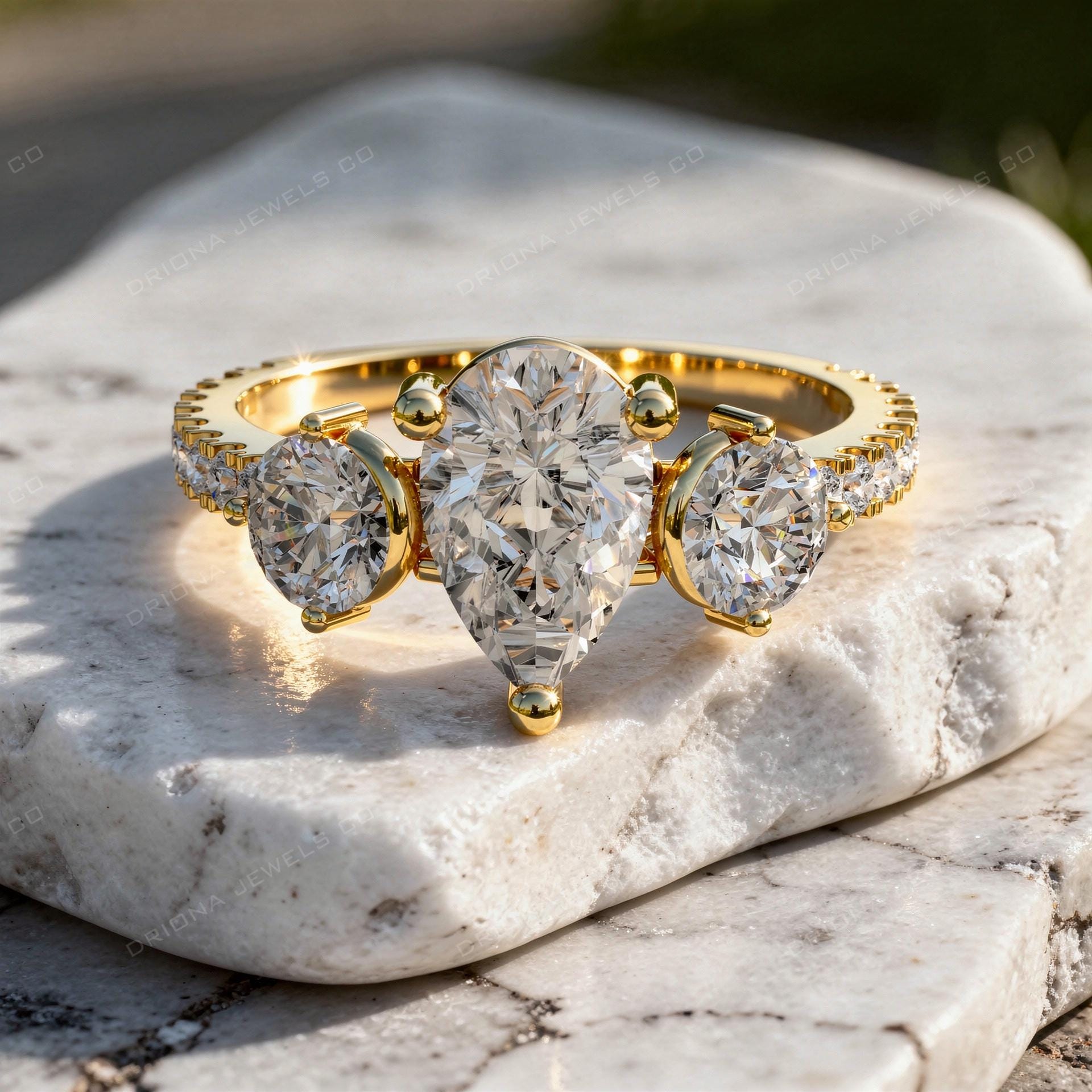 Designed to highlight the elongated beauty of the pear cut, this ring offers a perfect blend of classic elegance and modern luxury. The round side stones soften the design while adding depth and dimension from every angle.