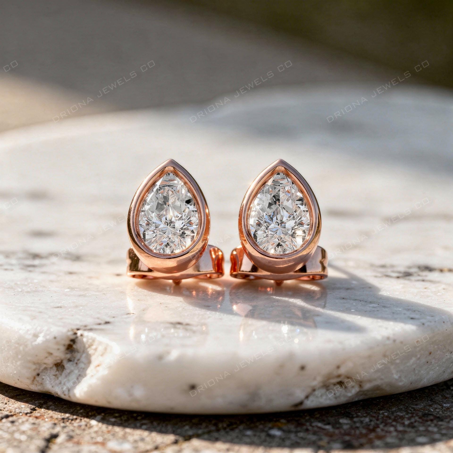 - Pear Cut Lab Grown Diamond Stud Earrings, Bezel Set Solitaire
