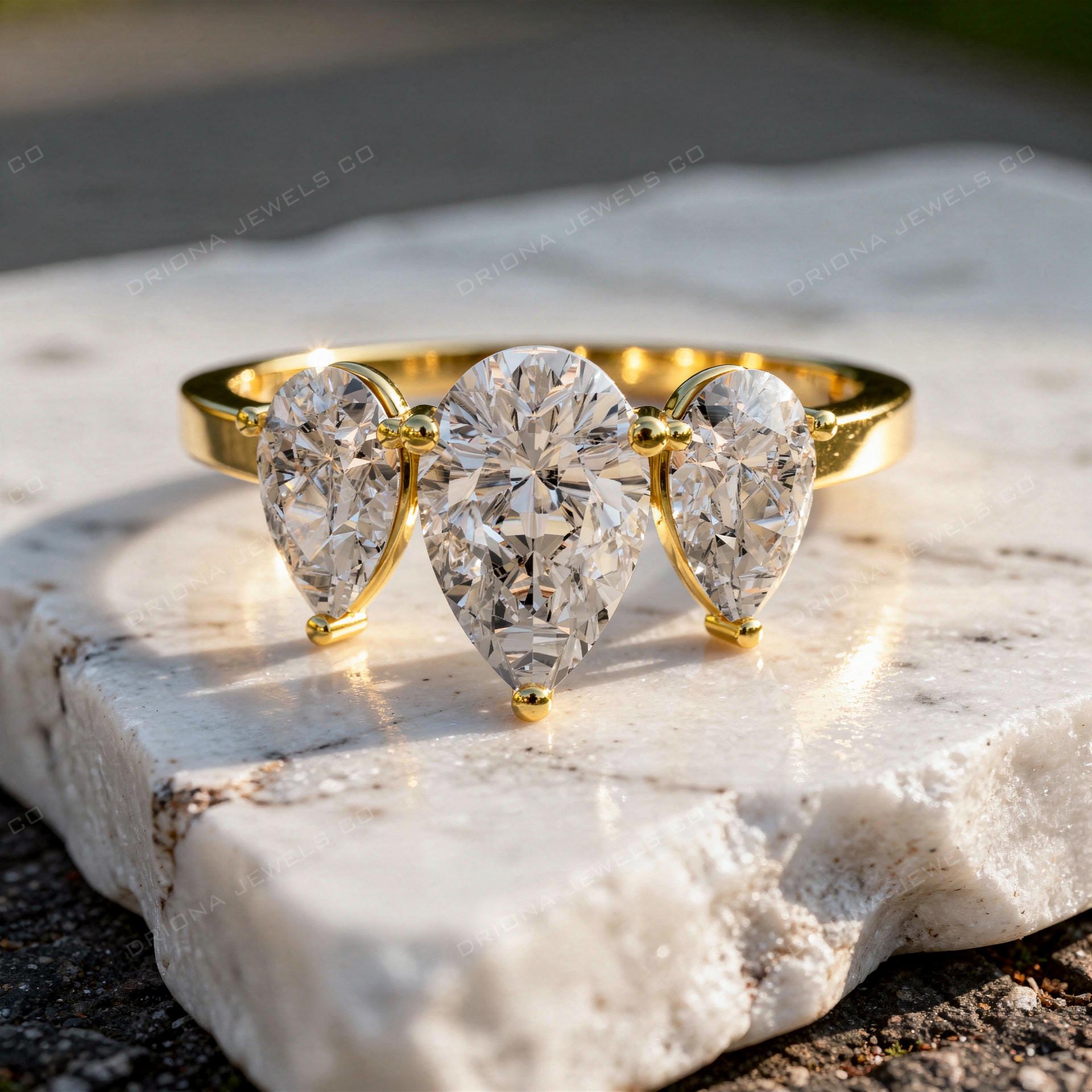 This pear cut three stone engagement ring features a brilliant pear-shaped center stone flanked by two perfectly matched pear side stones. The balanced symmetry enhances sparkle while maintaining a graceful, elongated silhouette on the finger.