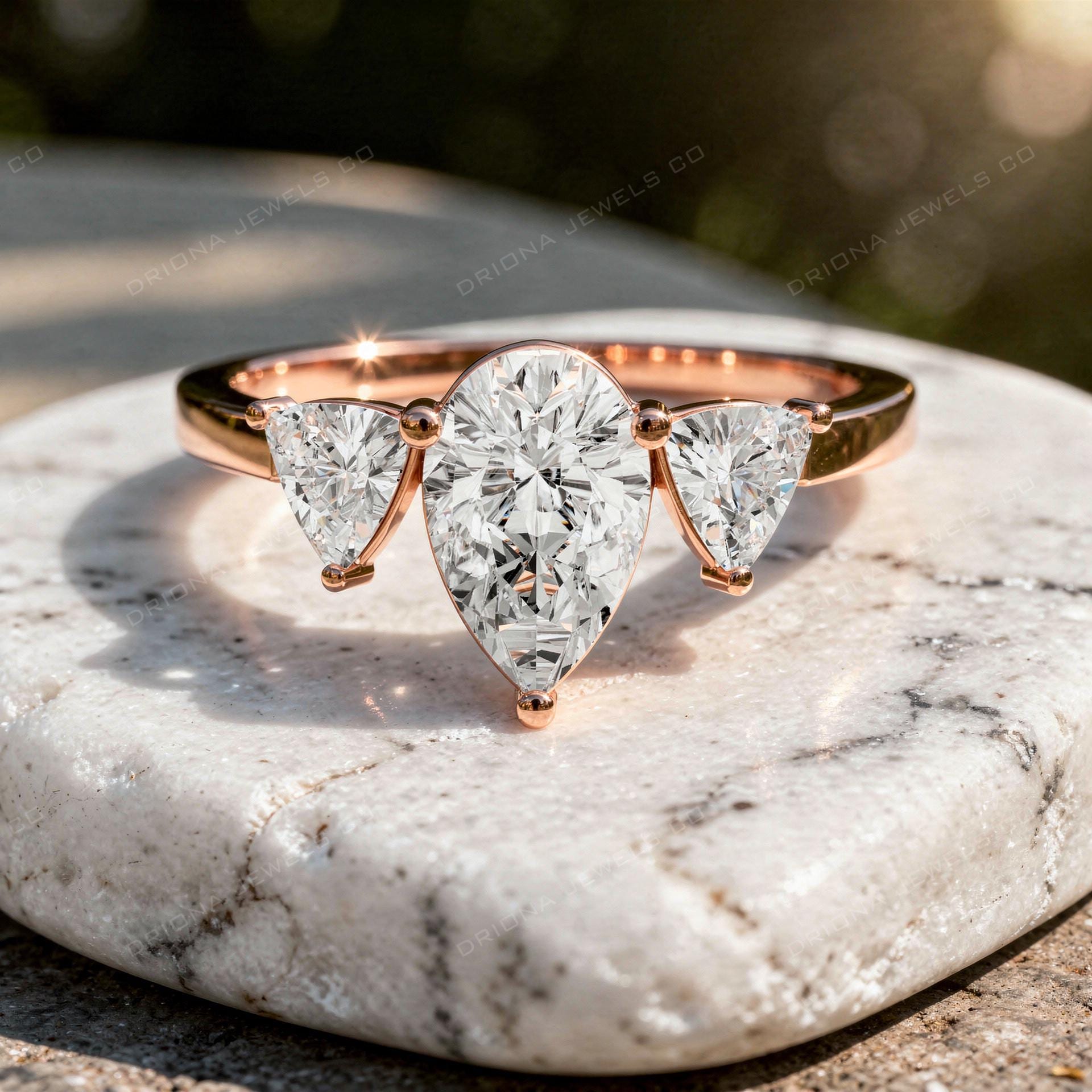 This pear cut three stone engagement ring showcases a brilliant pear-shaped center stone framed by two matching pear side stones. The elegant three-stone design symbolises the past, present, and future, making it a meaningful choice for engagements and special milestones.