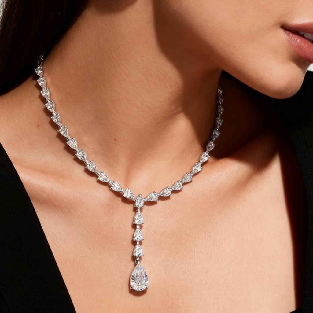 This stunning diamond tennis necklace features a continuous line offer pear shaped stones, finished with a graceful pear-shaped drop pendant. Designed to sit beautifully along the neckline, the vertical drop adds movement, brilliance, and a refined statement look.