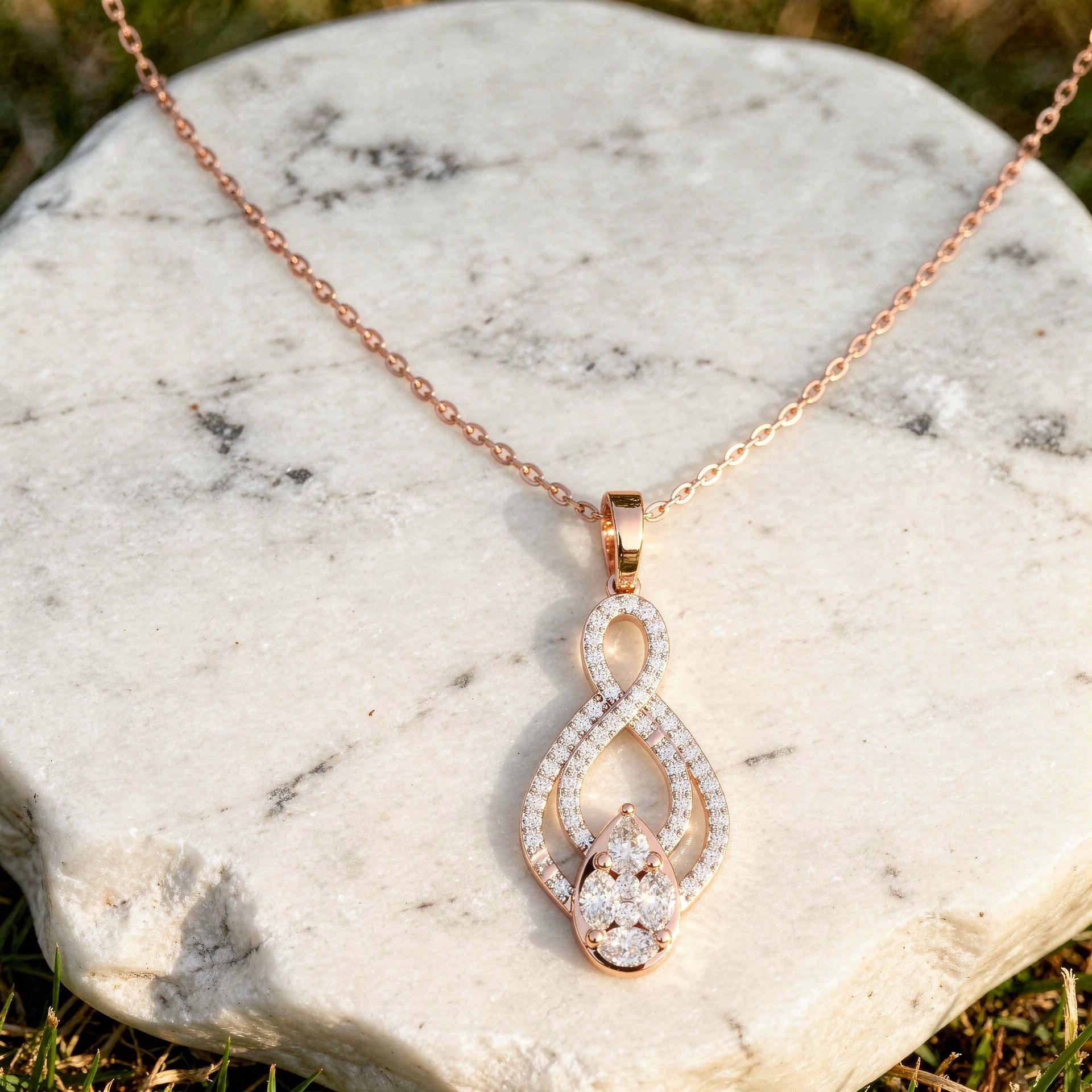 Designed to captivate, this pear diamond drop pendant necklace is crafted in radiant 14K rose gold. Featuring an elegant infinity-inspired silhouette adorned with shimmering pave-set diamonds, the design flows gracefully into a pear-shaped diamond cluster at the base.