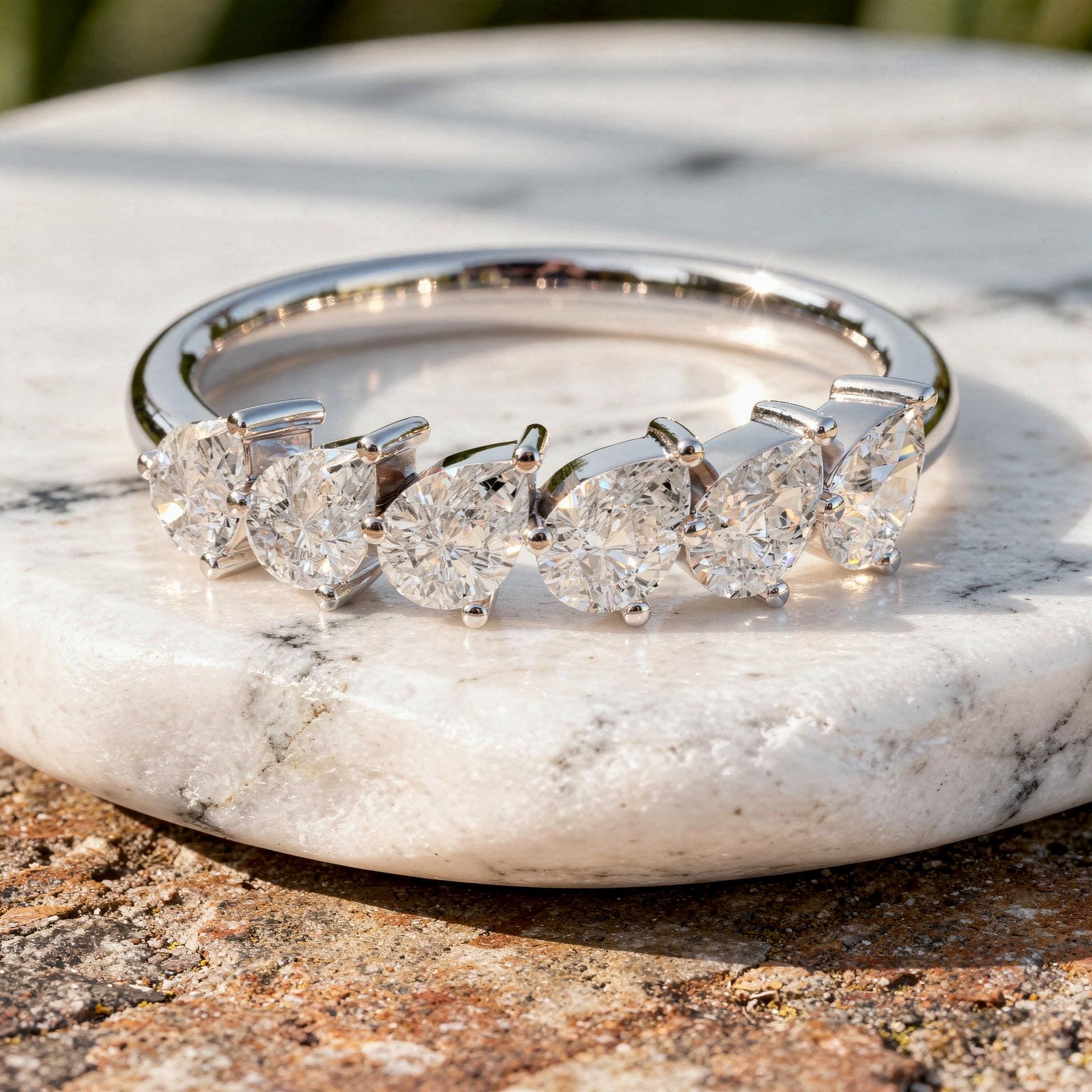 Designed as a modern half eternity band, this ring pairs beautifully with engagement rings or can be worn alone as a statement wedding band. The tapered pear shapes create a unique and elegant bridal look, perfect for women who prefer distinctive fine jewelry.