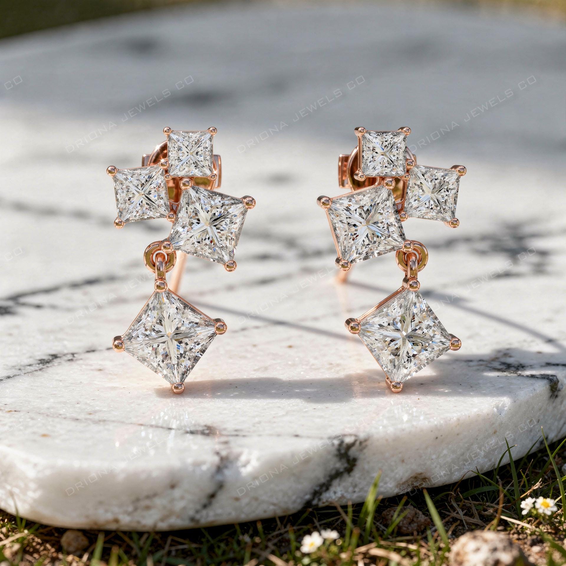 - Princess Cut Diamond Drop Earrings, Solid Gold Multi Square Dangle