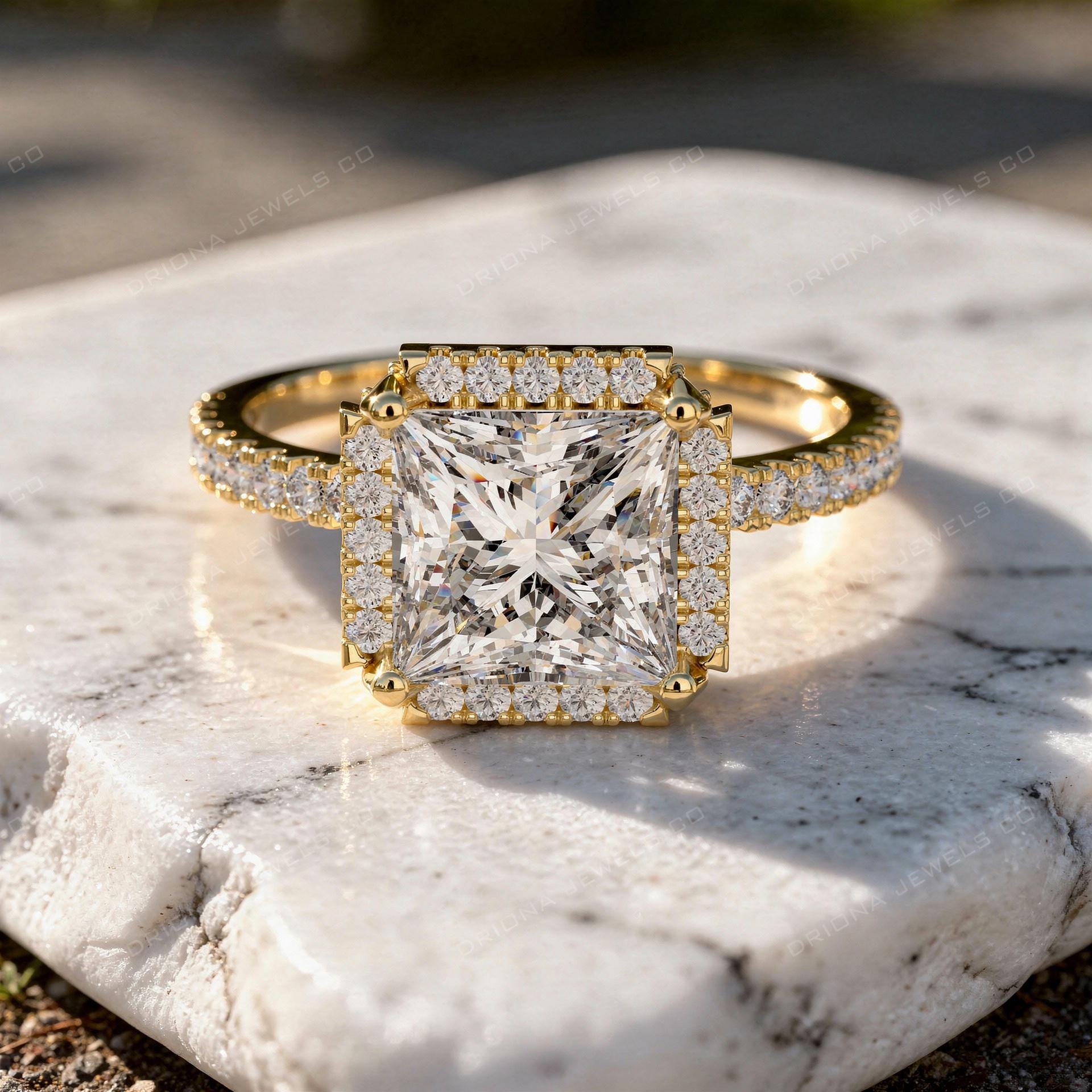 - Princess Cut Halo Engagement Ring, Pave Diamond Band, Solid Gold or Sterling Silver