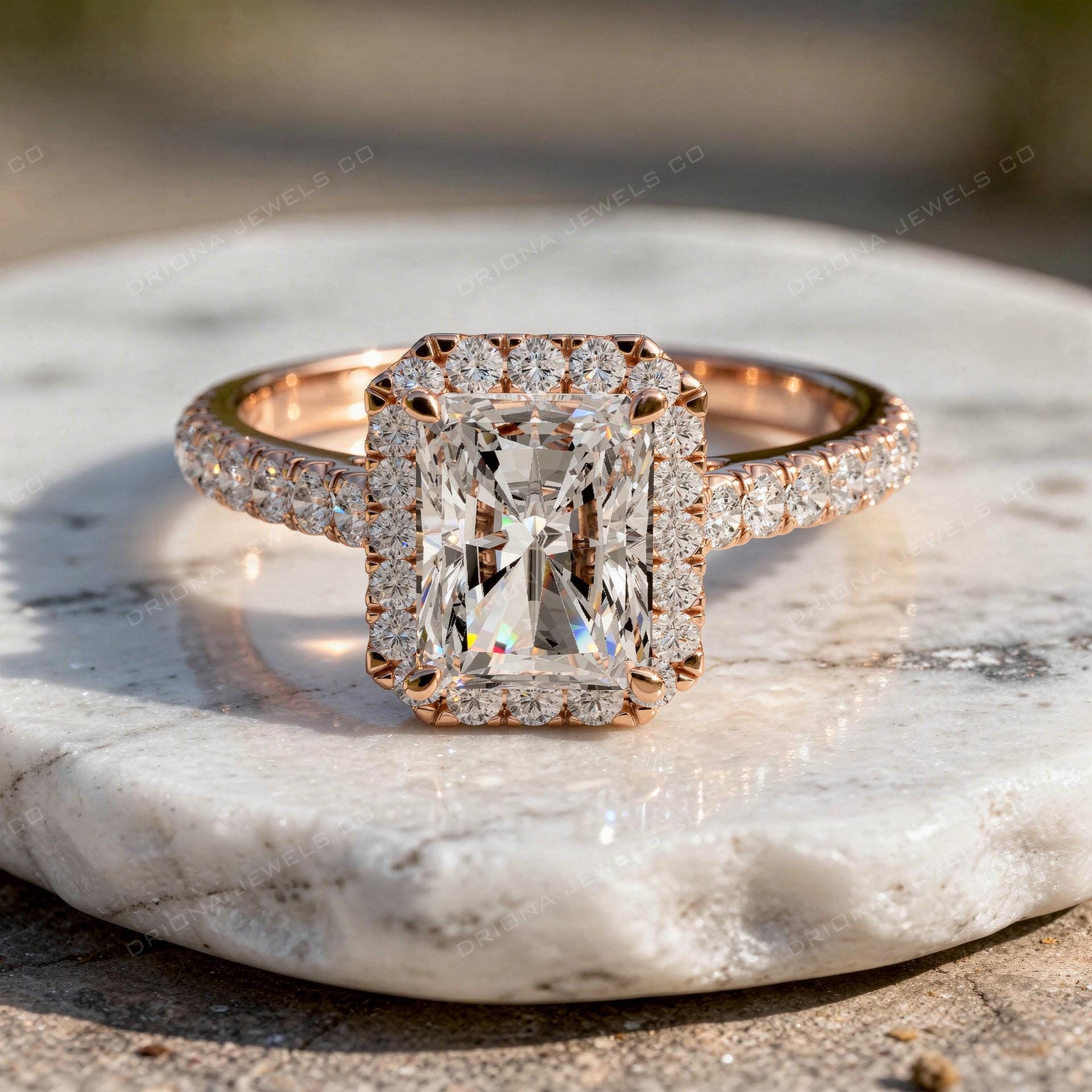 - Radiant Cut Diamond Halo Engagement Ring, Pavé Band, Solid Gold
