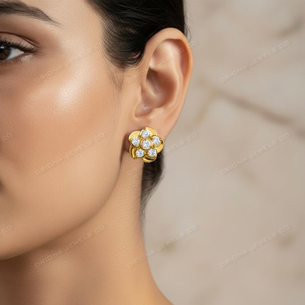 - Rose Gold Floral Diamond Stud Earrings, Minimalist Flower Design