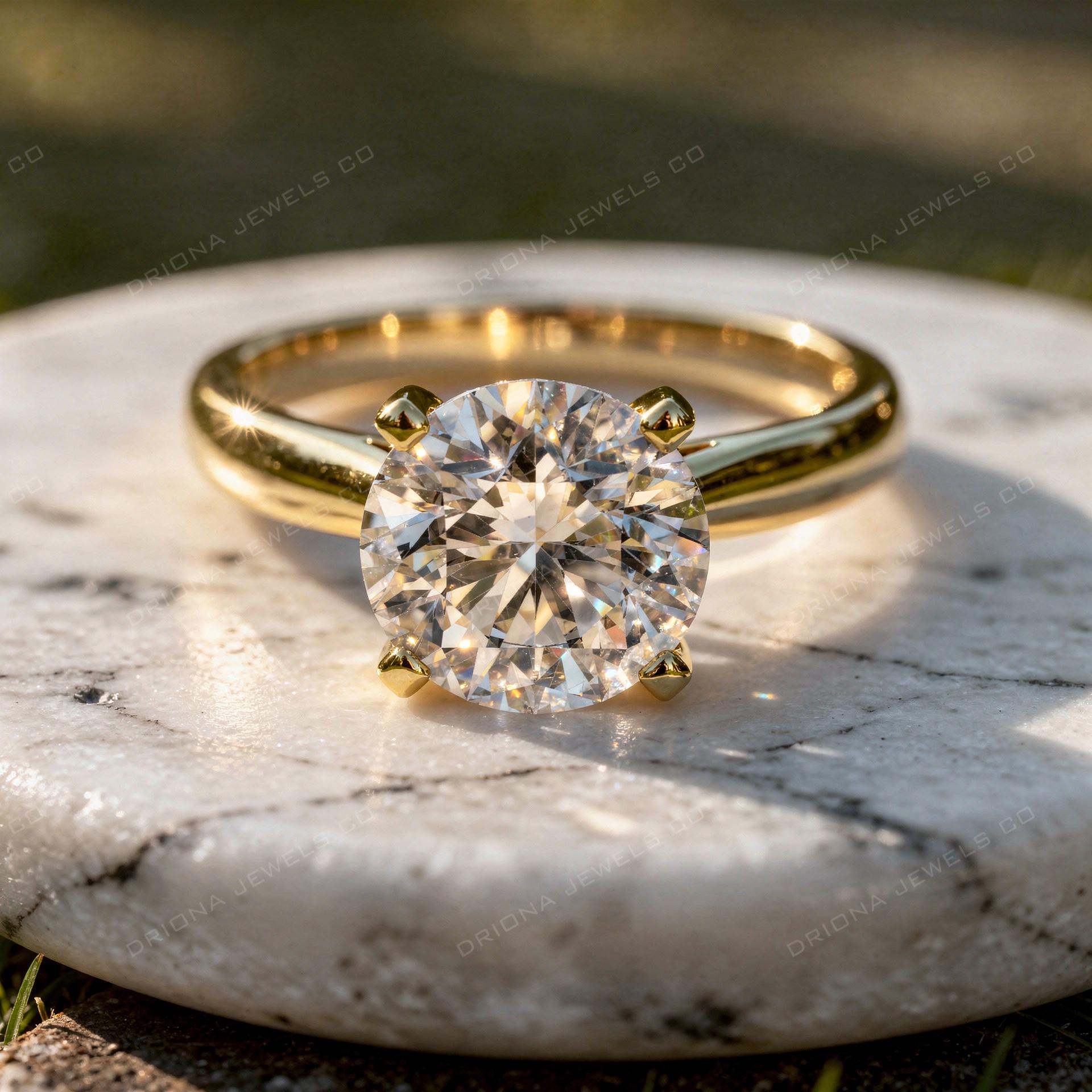 - Round Cut Solitaire Ring: Classic Prong Setting, Solid Gold or Sterling Silver