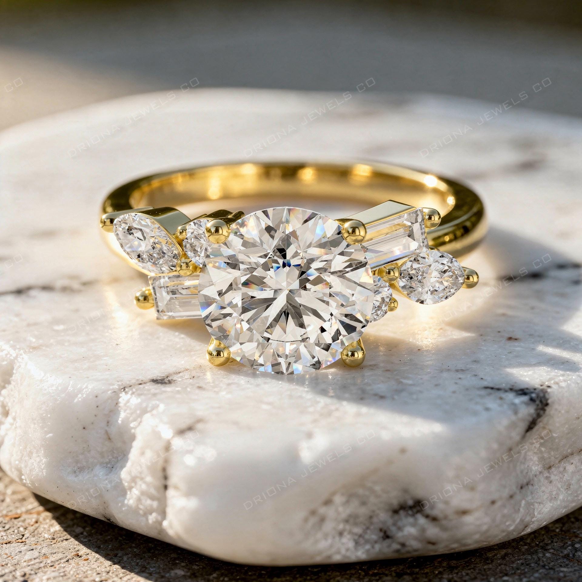 - Round Cut Three Stone Ring: Baguette & Pear Side Diamonds