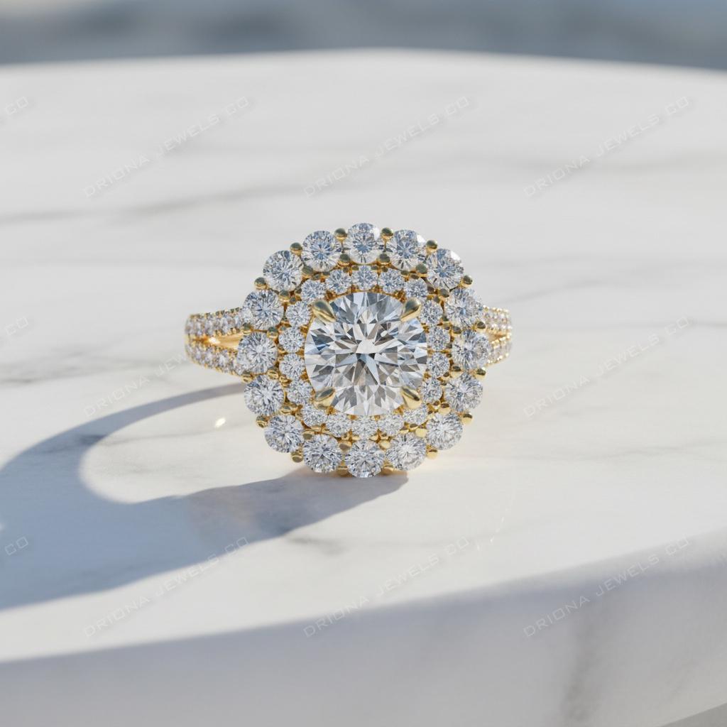 This breathtaking engagement ring showcases a brilliant round-cut center diamond surrounded by a striking double halo of meticulously set accent diamonds. The layered halo design creates exceptional depth and brilliance, amplifying the center stone’s presence while delivering a bold, luxurious look.
