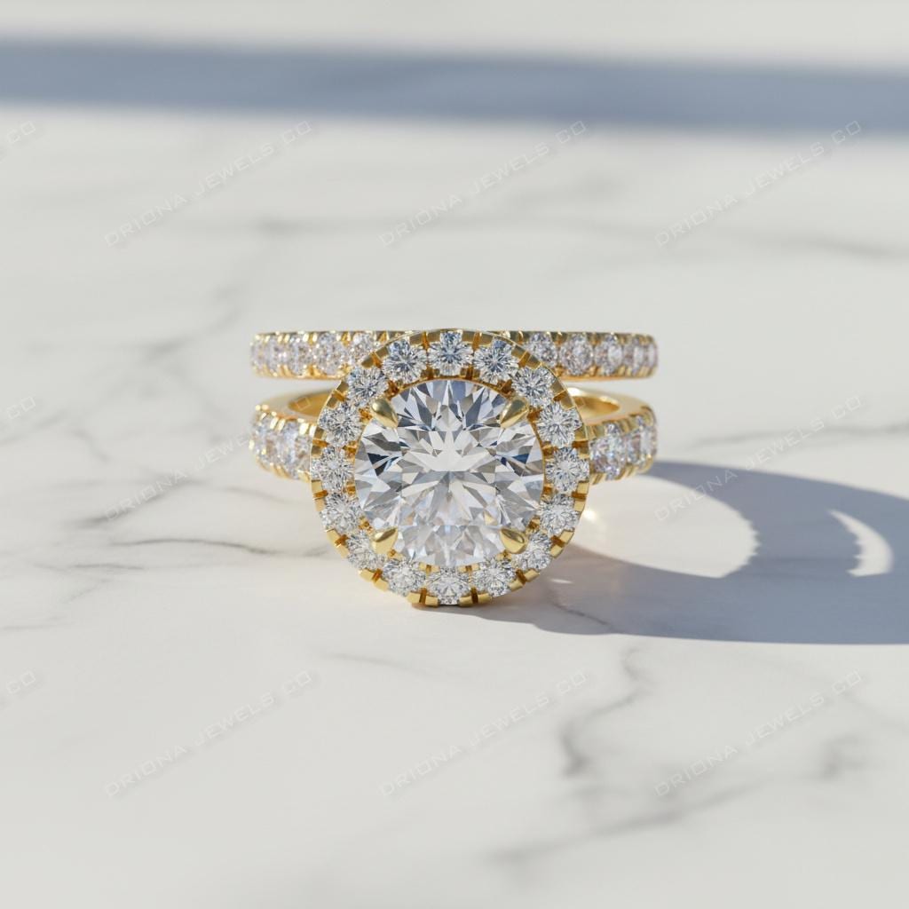 - Round Diamond Double Halo Engagement Ring, Pavé Split Band, Solid Gold or Sterling Silver