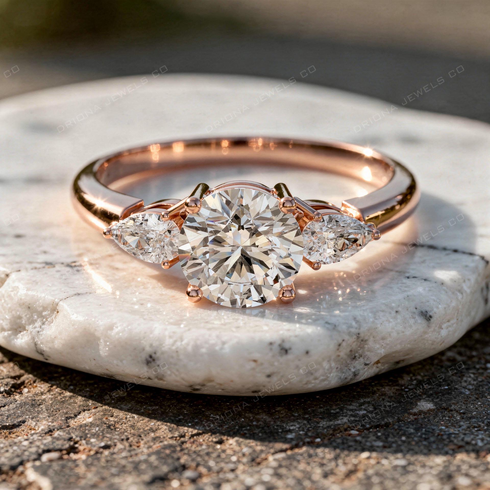 This timeless round engagement ring features a brilliant round-cut center stone accented by elegant marquise side stones that add a refined, elongated sparkle on each side.