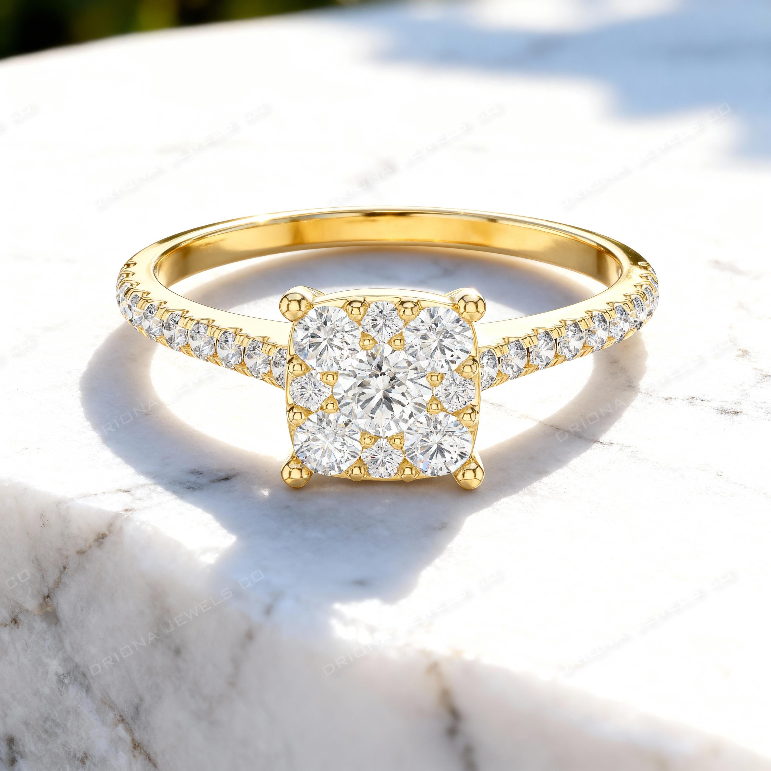 - Square Cluster Diamond Engagement Ring, Pavé Band, Solid Gold