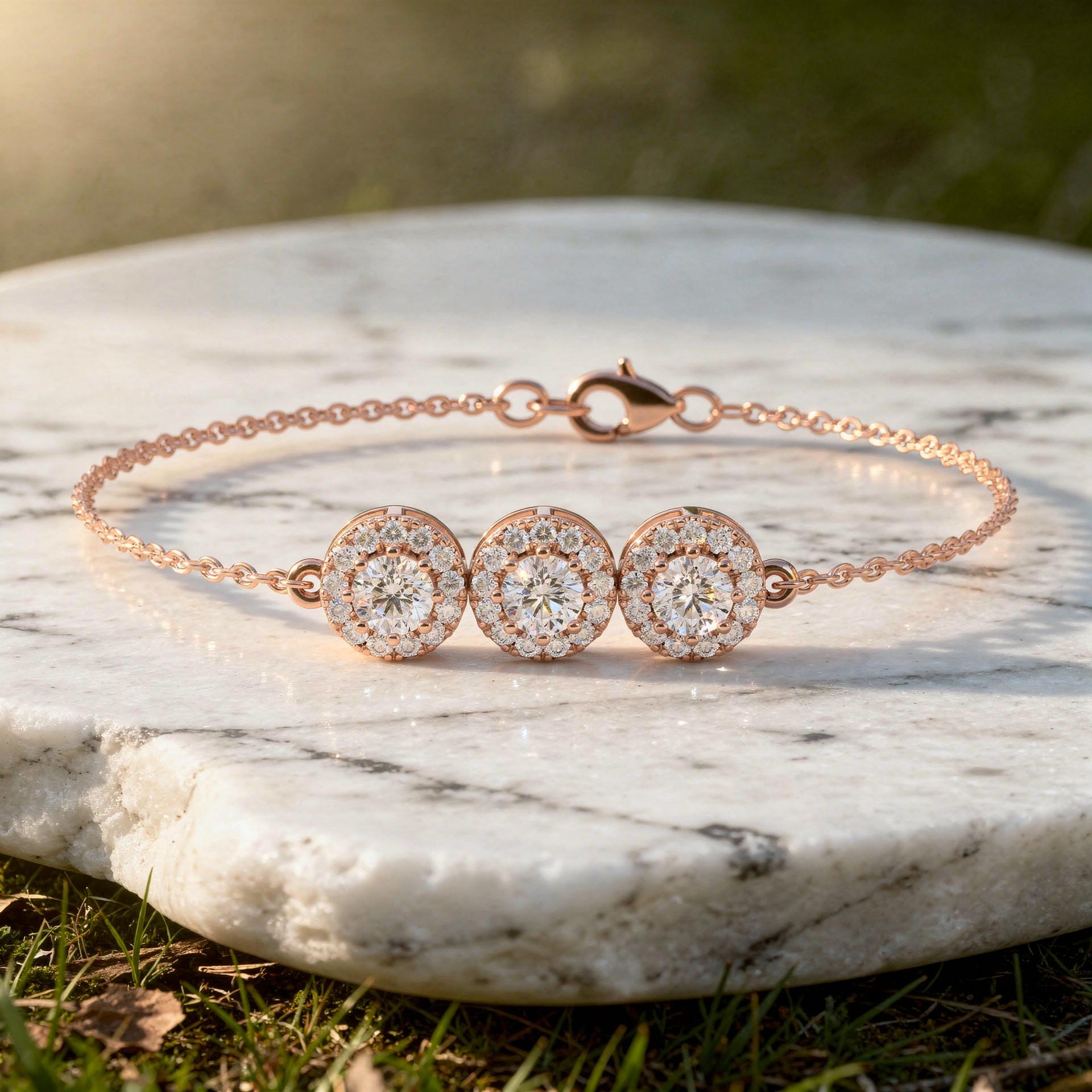 This elegant diamond bracelet showcases a refined three-stone design, each round diamond framed by a delicate halo of smaller diamonds. The balanced spacing and clean chain structure create a graceful, lightweight look that feels timeless and sophisticated.