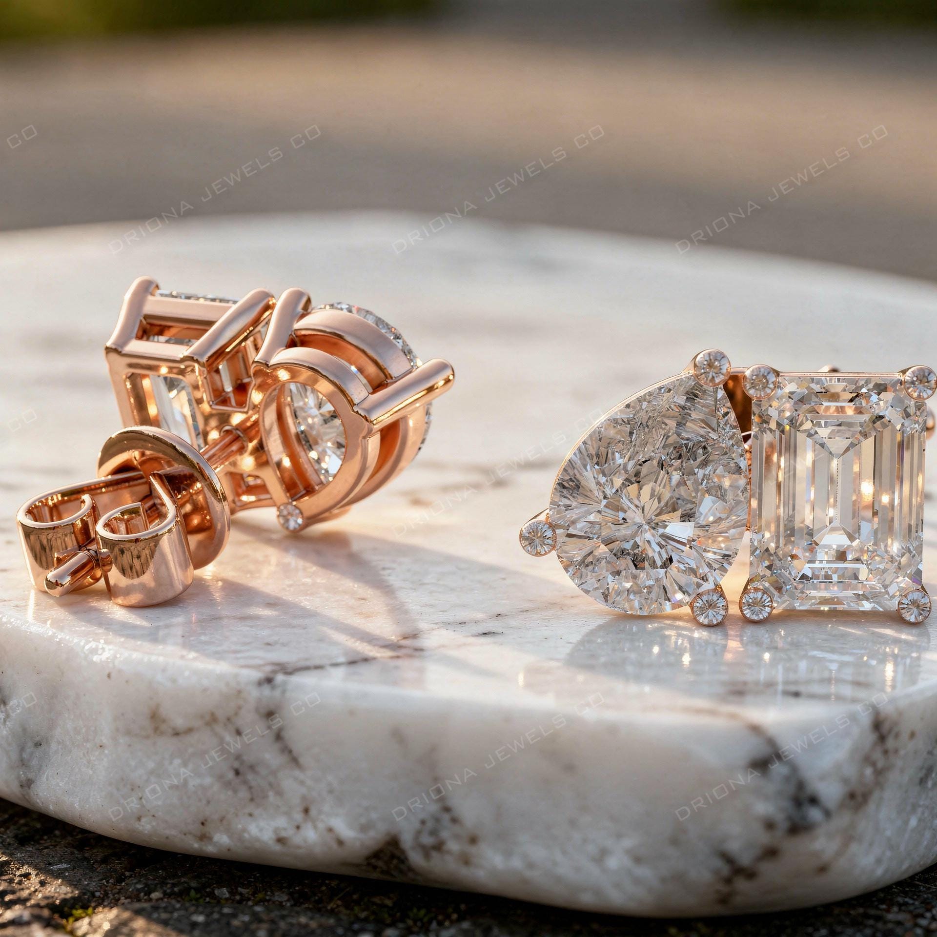 These elegant diamond stud earrings feature a refined two-stone design combining an emerald cut diamond with a round brilliant cut diamond for a sophisticated, modern look. Designed for comfort and security, these studs come with a push back closure, with an option to upgrade to screw back for added safety. Perfect for everyday wear or special occasions, these earrings offer timeless elegance with a contemporary touch.