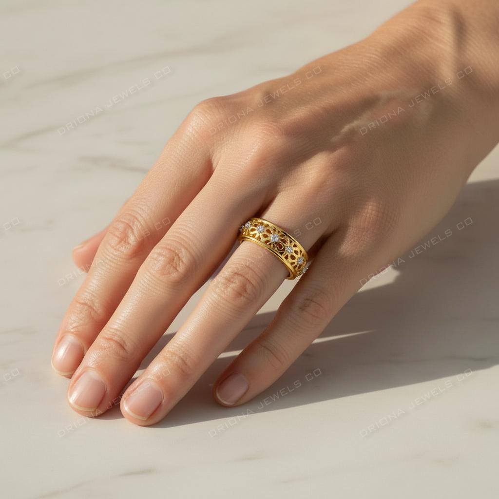 This elegant diamond wedding band features a refined sequence of bezel-set round diamonds, gracefully spaced across a decorative openwork gold shank. The alternating metal contours and diamond details create a soft, rhythmic design that feels timeless and romantic.
